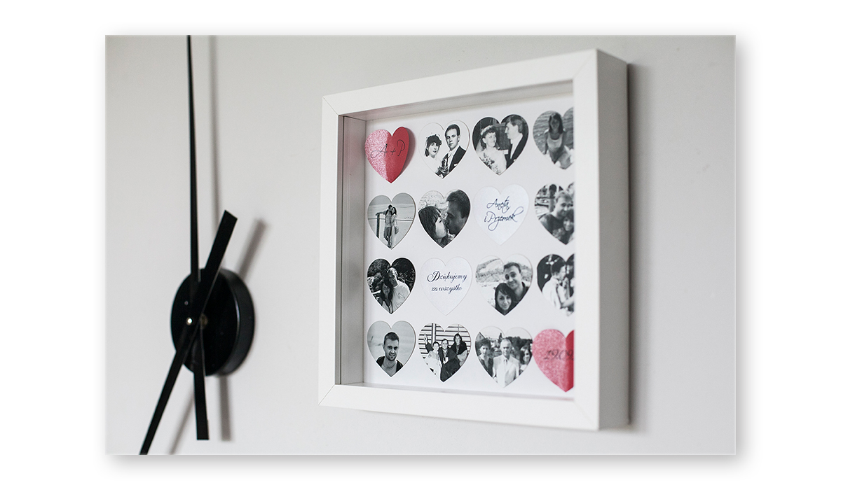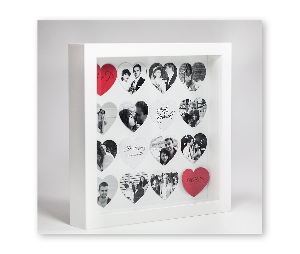 W skład zestawu wchodzi 16 serc wyciętych laserowo, naklejonych oraz oprawionych w przestrzenną ramę formatu 23x23cm.