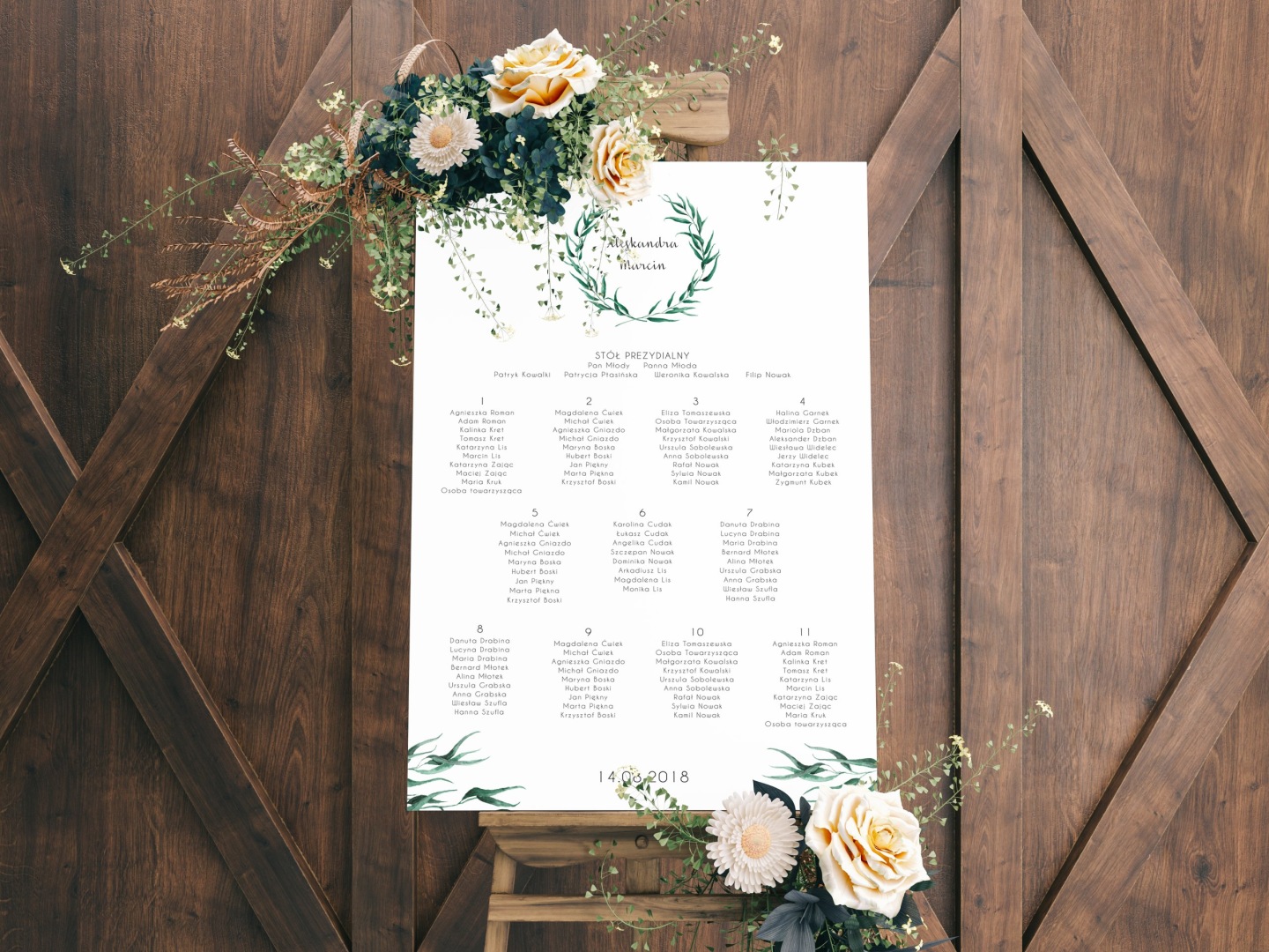 Oryginalna, sztywna i elegancka tablica, na której znajdują się listy gości usadzonych przez Was przy danym stole. Ustawiona przy wejściu pomoże gościom w odnalezieniu swojego miejsca na sali.