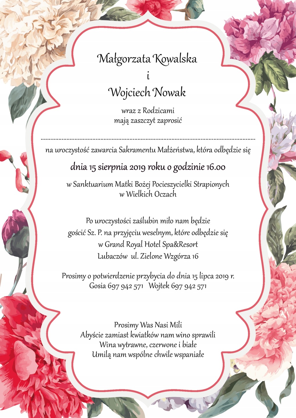 Prezentujemy zaproszenia ślubne, które gwarantują, że wasi goście będą oczarowani. Udostępniamy do wyboru teksty wierszyki i cytaty. Treść można dowolnie zmieniać.