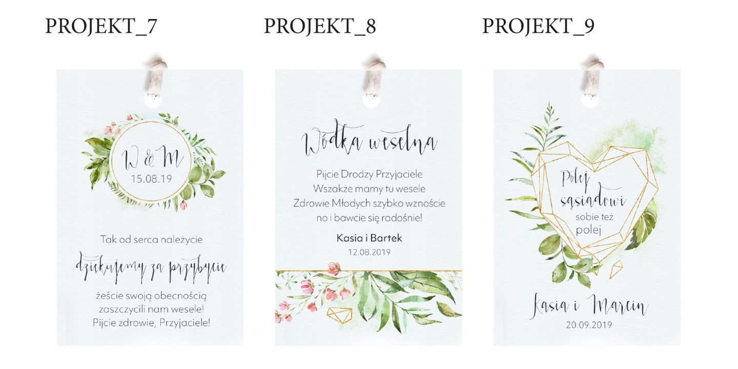 Oferujemy Państwu ręcznie wykonane zawieszki na butelki weselne. Prezentowany produkt jest w pełni personalizowany. Nasze zawieszki mogą zostać umieszczone nie tylko na wódce. Odpowiednio zmodyfikowane zastąpią etykiety na wino, domowe nalewki itp. Otrzymują Państwo elegancką ozdobę butelek, komponującą się z wystrojem sali i dekoracją stołu.